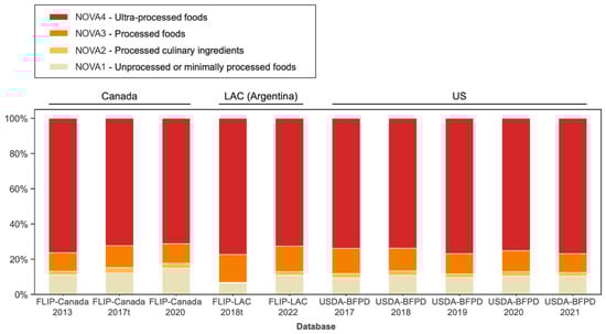 Moreover, between 11.2%, 2.7%, 14.9% (FLIP-Canada 2020), 14.4%, 2.1%, and 10.8% (FLIP-LAC 2022) and 10.7%, 2.0%, and 10.4% (USDA-BFPD 2021) of foods were classified as processed foods (NOVA 3), processed culinary ingredients (NOVA 2), and unprocessed or minimally processed foods (NOVA 1), respectively (Figure 4).