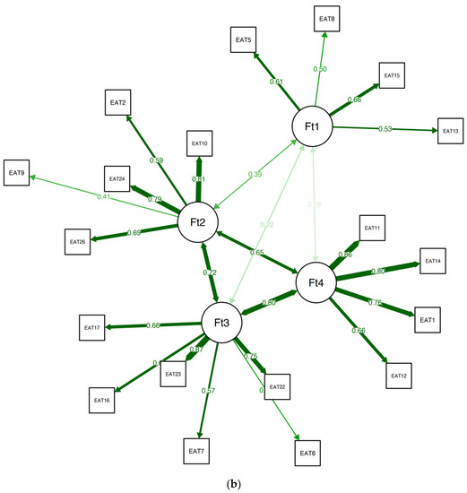 Figure 2. (a) The final CFA for clinical samples. (b) The final CFA for the suggested 19-item EAT version for non-clinical samples.