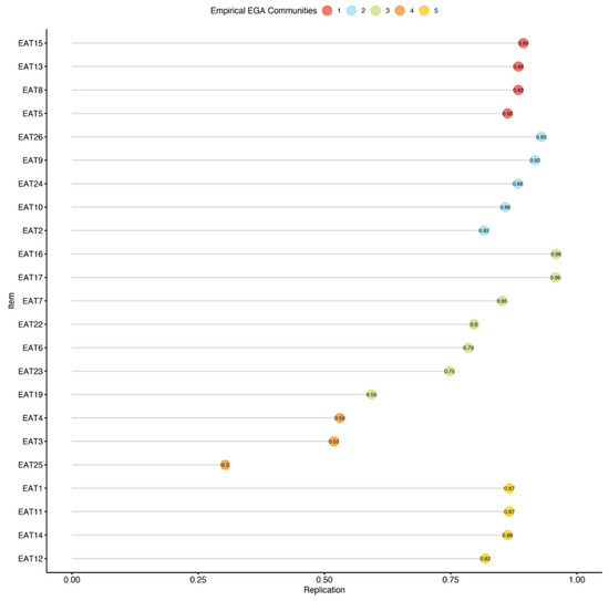 Following the assessment of factorial invariance (or lack thereof) between the clinical and non-clinical samples, we employed Exploratory Graph Analysis (EGA; [39]) using EGAnet R package—a network psychometrics method that uses undirected network models for the assessment of psychometric properties of questionnaires. Exploratory Graph Analysis was used to verify the number of factors using graphical lasso [40] and the items that are associated with each factor. Network loadings, which are roughly equivalent to factor loadings, are reported using net.loads(), with suggested general effect size guidelines for network loadings of 0.15 for small effect sizes, 0.25 for moderate effect sizes, and 0.35 for large effect sizes [41]. The number of factors corroborated other traditional methods—parallel analysis (PA), Velicer’s minimum average partial (MAP) test, and the comparison data approach [42]. Next, to examine the stability of the EGAs, we followed the analysis using Bootstrap EGA with 5000 resampling cycles. Finally, we used the novel Unique Variable Analysis (UVA [41]) for detecting redundant items in the EAT-26, and used the item Stability() function to detect highly unstable items.