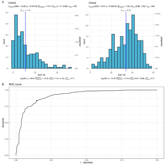 Figure 5. Distribution of EAT-19 scores for the clinical and non-clinical groups (A). Vertical blue lines refer to the mean sample score. The test reported in the upper section of panel A examined the difference between the sample mean and the suggested EAT-19 cutoff point (i.e., 22). In (B), the ROC curve for the estimation process of the optimal cutoff point is presented, with the black dot indicating the highest Youden’s index.