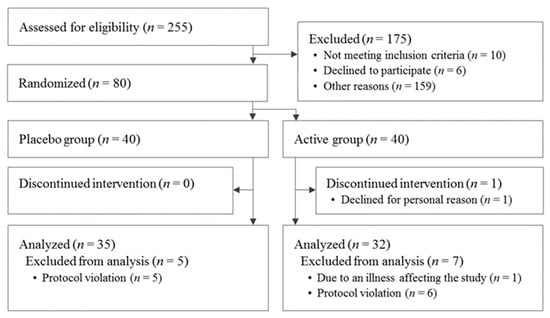 The participant selection process is shown in Figure 1. A total of 255 participants were screened for this study. After screening, 80 participants were eligible: 40 were assigned to the active group and 40 were assigned to the placebo. A significant difference in alkaline phosphatase levels between the active and placebo groups was observed at the beginning of the study but was deemed acceptable because it was within the reference range. For the other items, there were no differences in the baseline characteristics of the participants’ data (Table 2). By the end of the study, one participant from the active group withdrew for personal reasons. After the completion of the entire study, one participant from the placebo group was dropped due to an extremely irregular lifestyle. One participant from the active group was dropped due to a confirmed illness unrelated to the study that may have affected the results. In addition, nine participants were also excluded because they were found to have consumed drugs or foods during the study period that might have affected the results (n = 5 from the active group and n = 4 from the placebo group). Another participant in the active group was dropped due to partial missing primary-endpoint data. Thus, a total of 67 patients (32 in the active group and 35 in the placebo group) were included in the analysis. Moreover, four participants with reduced WHO-5-J scores were also excluded for Cognitrax analysis (n = 1 from the active group and n = 3 from the placebo group) because they had a score of ≤50, which is used as the cut-off for assigning a ‘screening diagnosis’ of depression in the global version of WHO-5 []; reduced WHO-5-J scores might indicate the possibility of earlier depression caused by isolation due to the COVID-19 pandemic, and thus Cognitrax tests may not have been performed properly in these participants. There were no reported harms or unintended effects in each group.