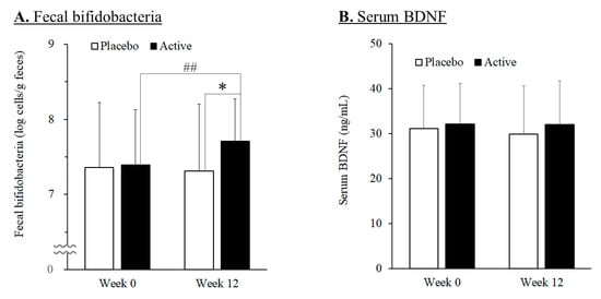 Changes in fecal bifidobacteria (A) and in serum BDNF (B) in the placebo (n = 35) and active (n = 32) groups during the study period. Values are means, with error bars as standard deviation. Double number signs (##) indicate p-value < 0.01 as a result of intra-group difference (week 0 vs. week 12; paired t-test). Asterisk (*) indicates p-value < 0.05 as a result of inter-group difference (the placebo group vs. the active group; unpaired t-test).