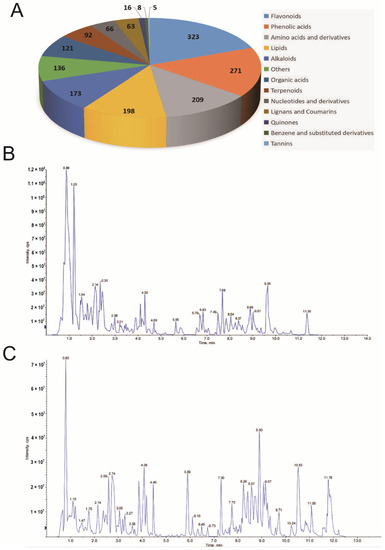 Analysis of RRA chemical compositions. (A) 1681 components were identified in RRA by widely targeted components analysis. (B) The total ion current diagram of RRA samples in positive ionization mode. (C) The total ion current diagram of RRA samples in negative ionization mode.