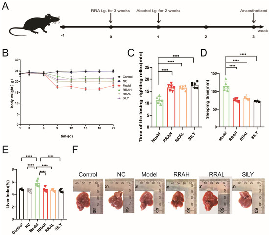 Effects of RRA on body weight, postural reflex and liver index of ALD mice. (A) Schematic illustration of animal experiment. (B) Body weight of mice. (C) The function of RRA on loss of righting reflex time of mice. (D) The effects of RRA on sleeping time of mice. (E) The effects of RRA on liver index of mice. (F) The effects of RRA on liver morphology. RRAH, 600 mg/kg·body weight; RRAL, 200 mg/kg·body weight. Data are shown as the mean ± SEM, n = 6. **** p < 0.0001.