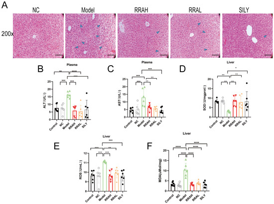 HE staining of the livers showed that RRA treatment alleviated the livers pathological injury in ALD mice, which were similar to the SILY group (Figure 3A). The ALT and AST levels of Model mice livers were elevated, and RRAL, RRAH and SILY could significantly reduce them (Figure 3B,C). SOD levels of Model group livers were lower than Control and NC groups, but administration of RRAL, RRAH and SILY significantly increased the SOD level (Figure 3D). In the ALD mouse model, ROS and MDA levels were notably increased; comparatively, RRAH, RRAL and SILY treatment significantly decreased ROS and MDA levels (Figure 3E,F).