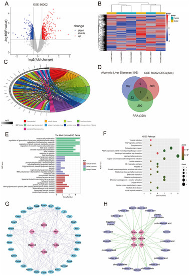 RRA may ameliorate ALD by regulating SPHK2 as determined by bioinformatic analysis. (A) Volcano plot of DEGs between ALD and Control groups in GSE86002. The red points demonstrate overexpression genes, blue points demonstrate down-expression genes and gray points demonstrate stable genes (p < 0.05). (B) Heatmap of DEGs between ALD and Control groups in GSE86002. (C) GO analysis of DEGs (Top 9 enriched terms). (D) Venn diagram of DEGs of GSE86002, potential target genes of RRA, and ALD-related genes. (E) GO analysis of overlapping genes. (F) Top 20 relevant pathways: analysis of KEGG pathways in overlapping genes. (G) PPI net of overlapping genes. The blue and pink points demonstrate overlapping genes, the edges demonstrate the interactivities of these genes. (H) Pharmacological targets and RRA compounds net against ALD. Pink points demonstrate the protein targets, purple points demonstrate the compounds, and edges demonstrate the interactivities of them.