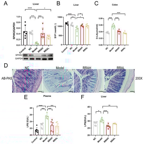 To confirm the effects of RRA on the intestinal barrier via SPHK2/S1P in ALD mice, the levels of associated factors were detected in liver tissues. In ALD Model groups, SPHK2 expression was downregulated, but administration of RRAL and RRAH upregulated SPHK2 expression (Figure 5A). Consequently, S1P levels were reduced in Model groups, comparatively, and RRAH and RRAL treatment obviously enhanced them (Figure 5B). Compared with the Model group, D-LA levels were significantly reduced in the colons of mice treated with RRAL and RRAH (Figure 5C). Colon AB−-PAS stains are shown in Figure 5D. It could be observed from the AB-PAS stains that mucin secretion increased in RRA groups, especially in the RRAH group. Further analysis showed that mucin density and the degree of mucin alignment significantly reduced in the ALD model group. The levels of LPS in ALD model plasma were notably increased by damaging the intestinal barrier, and RRAL and RRAH treatment remarkably reduced LPS in the plasma (Figure 5E). Thus, LPS showed a marked increase in the ALD model liver via the gut–liver axis, and administration of RRAH and RRAL significantly decreased LPS in the liver (Figure 5F). Taken together, RRA maintained the intestinal barrier and decreased the LPS level in the ALD mice by upregulating SPHK2/S1P.