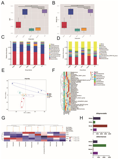To further explore the mechanisms of RRA on ALD model mice, we analyzed the microbiota 16s rDNA of mice feces. Results showed that the Chao 1 and Observed OTUs indexes were remarkably decreased in the Model group, and RRAH treatment restored those tendencies (Figure 7A,B). Results of top 10 intestinal bacteria at phyla and genera are shown in Figure 7C,D, respectively. Moreover, the similarities of gut microbiota composition were analyzed by PCA. Results showed that microflora in the ALD Model was obvious to distinguish from that in NC group, and RRAH and RRAL treatment improved the microflora of ALD mice (Figure 7E). Results of the top 35 intestinal bacteria at genera are shown in Figure 7F. To identify the important bacteria in ALD mice after RRA administration, the MetaStat method was performed in genus levels (Figure 7G). Akkermansia and Alloprevotella were found as key bacterium by MetaStat analysis (Figure 7H). Specifically, Akkermansia was associated with the intestinal barrier [33], and Alloprevotella was closely related to relieved intestinal inflammation and reduced intestinal diseases [34,35].