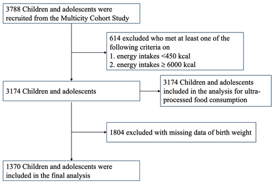 A retrospective cohort study was conducted on 3788 available children and adolescents from Shanghai, Jiaxing, Dezhou, Suqian, Taizhou and Fuyang across eastern China between 2019 and 2021. We selected cities with upper, moderate and lower levels of socioeconomic status based on data reported in 2018 by the National Bureau of Statistics of China [32] to provide a regional representative database. Children were randomly selected from each grade in nine primary and secondary private and public schools based on using random numbers via computer systems. Children who had serious organ disease, abnormal physical development or physical impairments were excluded from this study. Parents and children were informed of the study by class teachers, and those children whose parents provided written informed consent were recruited. Children aged 12 years or older also provided the simple version of written informed consent. The structured questionnaire was required to be completed to collect information on demographic characteristics, lifestyle behavior, dietary intake, obstetrics and medical history. A subgroup analysis of the dataset from this observational study was performed by selecting participants who had birth record data (n = 1370) (Figure 1). Data were analyzed from 1 January 2022 to 31 May 2022. The study was approved by the Ethics Committee of the School of Public Health of Shanghai Jiao Tong University for Human Subject Research, and all parents gave written informed consent (No. SJUPN-201815).