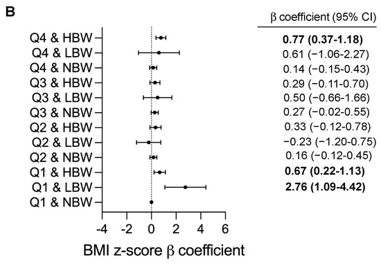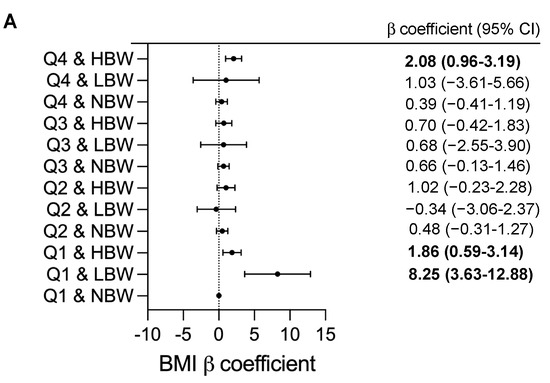 Adjusted β coefficients (95%CI) for childhood BMI measurements according to combined effect of birthweight and UPF consumption. BMI, body mass index; CI, confidence interval; Q: quartile; NBW, normal birthweight; LBW, low birthweight; HBW, high birthweight. β coefficients (95%CI) were calculated using a generalized linear model and adjusted for child’s age and sex (male or female), family income (annual incomes <80,000 RMB, 80,000 to 150.000 RMB or ≥150,000 RMB); maternal education (less than high school, high school and general equivalency, college graduate and above), maternal BMI status (<18.5, 18.5 to 24, 24 to 28, ≥28), physical activity (moderate-to-vigorous physical activity per day <30 min, 30 to 60 min or ≥60 min), child’s total daily energy intake (continuous), breastfeeding (Never, <6 month, ≥6 months), gestational age at delivery (Preterm and early term, full term, late or post-term) and delivery mode (vaginal delivery, caesarean delivery). Q1 and NBW as reference; p-value < 0.05 are in bold type. (A) Adjusted β coefficients (95%CI) for childhood BMI, (B) Adjusted β coefficients (95%CI) for childhood BMI z-score.