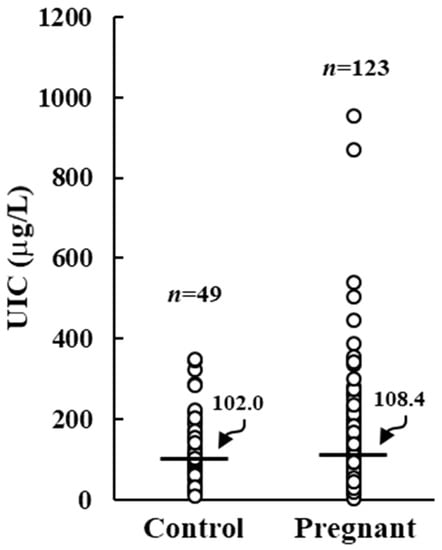 Urinary iodine concentration (UIC) in control and pregnant women. Horizontal bars indicate the median values.