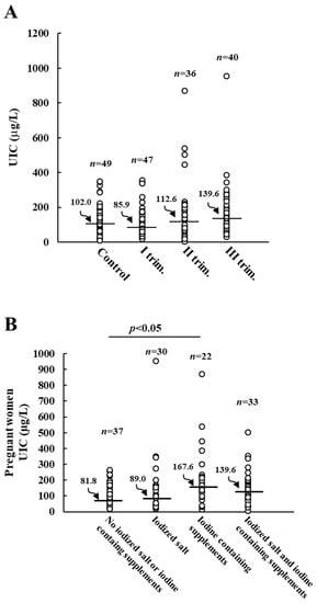 Urinary iodine concentration (UIC) in control and pregnant women. Panel (A): UIC of control and pregnant women grouped by trimester of pregnancy. Panel (B): effects of regular consumption of iodine-containing salt and/or supplements on UIC values of pregnant women. Horizontal bars indicate the median values.