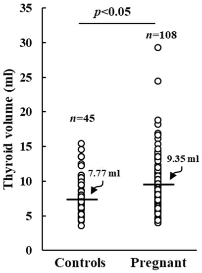 Thyroid volume in control and pregnant women. Horizontal bars indicate the median values.