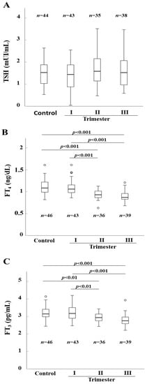 Finally, no significant changes could be observed in the median TSH serum level between control and pregnant women in the different trimesters of gestation, while FT4 and FT3 serum concentrations were significantly lower in pregnant women in the second and third trimester of gestation as compared to control and pregnant women at the first trimester of gestation. These data appear to corroborate previous studies documenting a physiological gradual decrease of FT4 serum levels with the increasing gestational age [34,35,36,37].