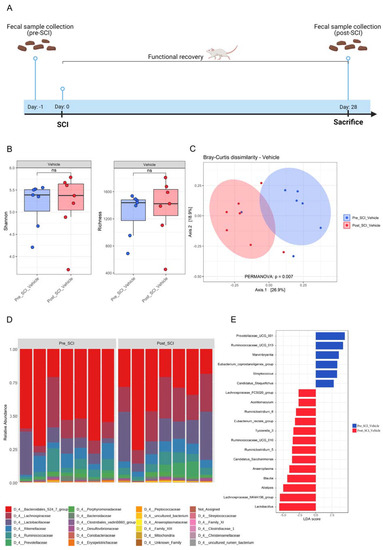 Impact of spinal cord injury on the composition and richness of the gut microbiota. (A) Schematic representation of the experimental setup. Fecal samples were collected 1 day before spinal cord injury (SCI) induction. From day 1 post-injury, functional recovery was assessed using the Basso Mouse Scale (BMS) score. After 28 days, mice were sacrificed, and fecal samples were collected again. n = 7. (B) Effect of SCI on alpha diversity of gut microbiota in fecal samples of vehicle-treated mice, Shannon (left) and microbial richness (Observed OTUs) (right). (C) The impact of SCI on the overall composition of the gut microbiota as Principal Coordinate Analysis of the Bray–Curtis dissimilarity matrix between samples from the vehicle-treated group. The distance between centroids of the two groups was tested using the PERMANOVA test (function “adonis” in the R package “vegan”). (D) Stacked bar graph of relative abundances (%) for individual gut microbiota composition at family level pre- and post-SCI. (E) The main bacteria contributing to the differences in composition before and after SCI in the vehicle-treated group. Linear Discriminant Analysis (LDA) effect size analysis (LEfSe) revealed significant bacterial differences in fecal microbiota pre- and post-SCI.