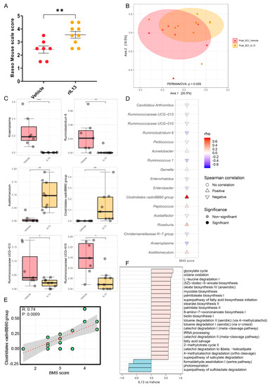 Il-13 has been described to exert anti-inflammatory effects in SCI models [43]. Therefore, we evaluated whether systemic rIL-13 treatment could influence functional recovery after SCI and whether this relates to the gut microbiota composition (Figure S2A). Our data showed that rIL-13 treatment significantly improved functional recovery compared to vehicle at 28 dpi (Figure 2A). Of note, rIL-13-treated mice reached an average score of 3.6, which is more than 1.1 points higher than the vehicle group with a mean score of 2.4. Overall, this means that highly impaired mice that show only extensive ankle movement develop an occasional plantar-stepping pattern [50]. We further investigated the gut microbiota differences between the rIL-13-treated and control groups. Analysis of alpha diversity of the gut microbiome using the Shannon and richness indices showed that the difference did not reach statistical significance (Figure S2B). However, PERMANOVA analysis revealed that bacterial composition significantly differed (PERMANOVA, R2 = 0.11, p = 0.029) between the two groups (Figure 2B). Next, we examined the differences in microbial community composition between the rIL-13- and vehicle-treated SCI mice. The phylogenetic classification of bacterial phyla revealed a higher Firmicutes/Bacteroidetes ratio in the rIL-13-treated mice group, although the difference did not reach statistical significance (Figure S2C,D). Interestingly, at the genus level, we found significant highlighted differences in the abundance of certain microbial taxa between the two groups in the gut (Figure 2C). We observed that the presence of Clostridiales vadin BB60 and Acetitomaculum were increased in the rIL-13-treated group, while Anaeroplasma, Ruminiclostridium_6 and Ruminococcaceae UCG-013 and Ruminococcaceae UCG-010 were decreased in relative abundance following rIL-13 treatment compared to vehicle. Spearman’s correlations were calculated between the functional recovery of the mice after SCI. Interestingly, Clostridiales vadin BB60 had a significant positive correlation (r = 0.74, p = 0.0009) with functional recovery of mice after SCI regardless of treatment groups (Figure 2D,E).