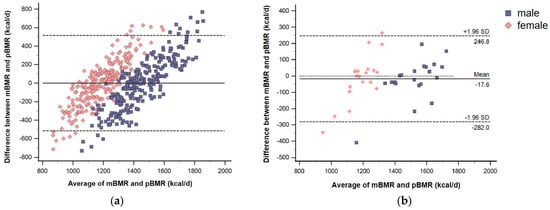 Bland–Altman plots describing the agreement between mBMR and pBMR from new equation in this study. (a) Description of the training dataset; (b) description of the testing dataset (n = 41). Delta mBMR–pBMR (kcal/d) is plotted against the average of mBMR and pBMR (kcal/d). Solid horizontal line indicates the mean difference between the two methods in kcal/day. Dashed lines depict the 95% limits of agreement (mean difference ± 1.96 SD) expressed in kcal/day. Participants were filtered by sex (pink represents female and blue represents male).