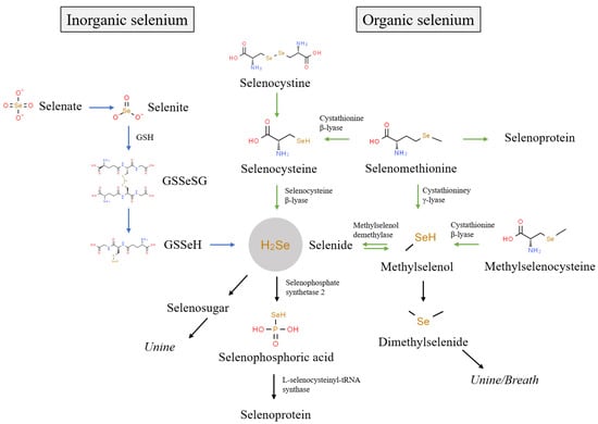 The biological functions of selenium are primarily achieved through its metabolism into 25 selenoproteins in an organism []. The biological activity of selenium in foods depends upon its chemical species []. Generally, the existing species of selenium in foods are mainly divided into inorganic selenium (e.g., Se(IV) and Se(VI)) and organic selenium (e.g., SeCys2, MeSeCys, SeMet, and SeCys). Figure 1 shows the metabolism of different selenium species in organisms. Inorganic selenium, such as Se(IV) and Se(VI), is absorbed via passive diffusion and co-transport [], while organic selenium with a higher absorption rate is absorbed via the active absorption pathway of amino acid []. In organisms, Se(VI) is reduced to Se(IV), which is further reduced into selenodiglutathione (GSSeSG), selenenylsulfide (GSSeH), and hydrogen selenide (H2Se) []. SeMet participates in the synthesis of selenium protein instead of methionine or is metabolized to SeCys via trans-sulfurization []. SeCys2 is reduced to SeCys by glutathione and glutathione reductase, and SeCys is converted to H2Se under the action of selenocysteine β-lyase [,]. In addition, MeSeCys is cleaved to methylselenol by cystathionine β-lyase, and further converted to H2Se under the demethylation reaction of methylselenol demethylase []. As can be seen, different selenium species are eventually metabolized to H2Se, which is involved in selenoprotein synthesis after activation to selenophosphoric acid []. The excess H2Se in tissues is further metabolized into methylselenol, dimethylselenide, and selenosugars, which are mainly excreted in urine and breath [,,].