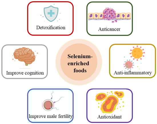Several researchers have revealed that selenium combined with other active nutrients such as zinc and vitamin E in food could initiate synergistic health effects on various biological activities []. Figure 3 illustrates the diverse physiological functions of selenium-enriched foods, including antioxidant, anti-inflammatory, and anticancer effects; detoxification; improvement of male fertility; and others [].