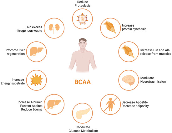 BCAA derived from the diet largely bypasses first-pass hepatic catabolism, and their catabolic disposal primarily occurs in skeletal muscle, making them a preferred source of amino acids in patients with liver disease [39]. Numerous clinical trials have demonstrated the beneficial effects of BCAA supplementation in liver failure, including improvements in nutritional status, HE, and health-related quality of life (HRQoL) [40,41] (see Figure 1). Nonetheless, these results were not replicated in other studies [42], leaving a degree of uncertainty with regards to the potential therapeutic efficacy of the different outcomes of ACLD.