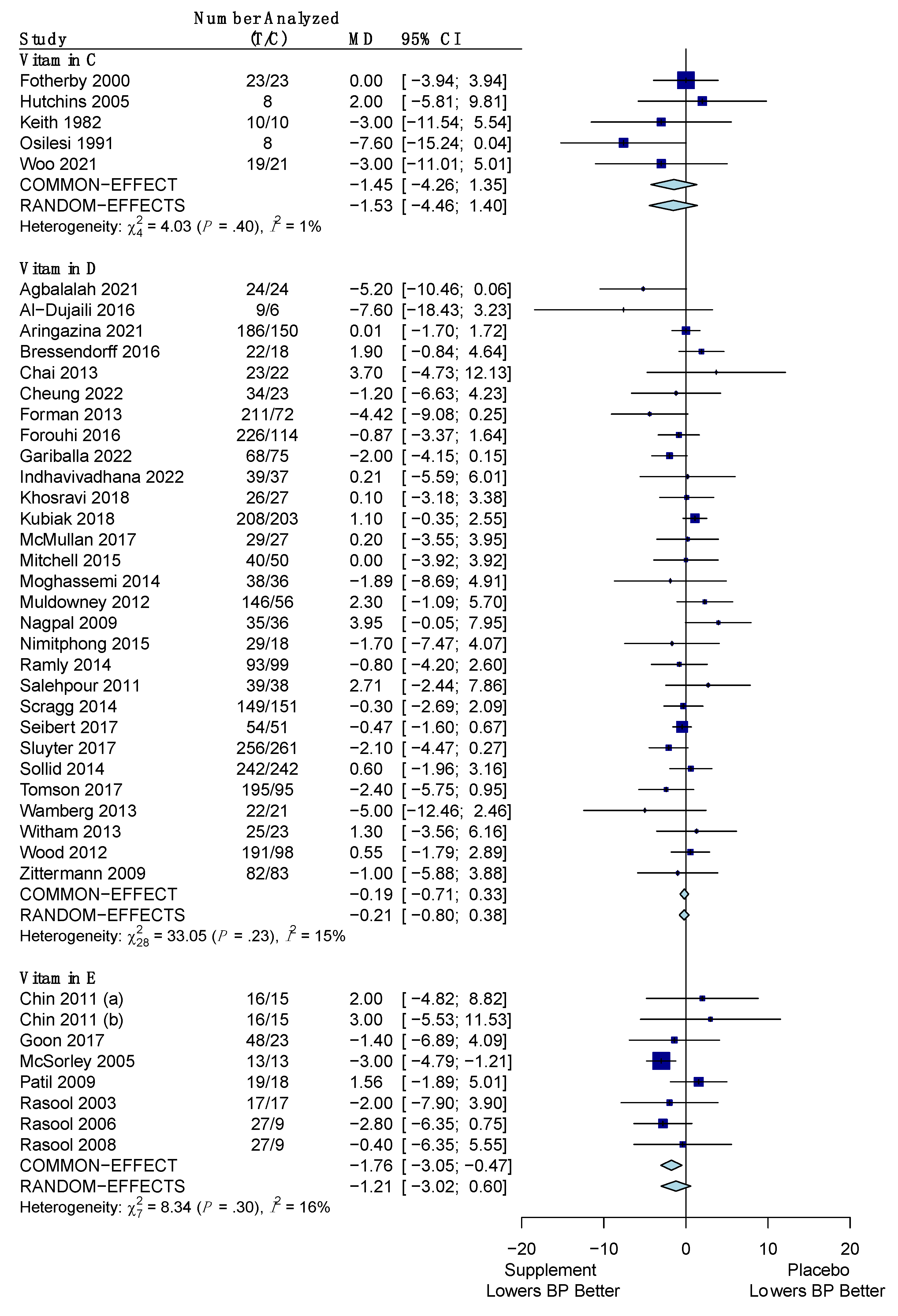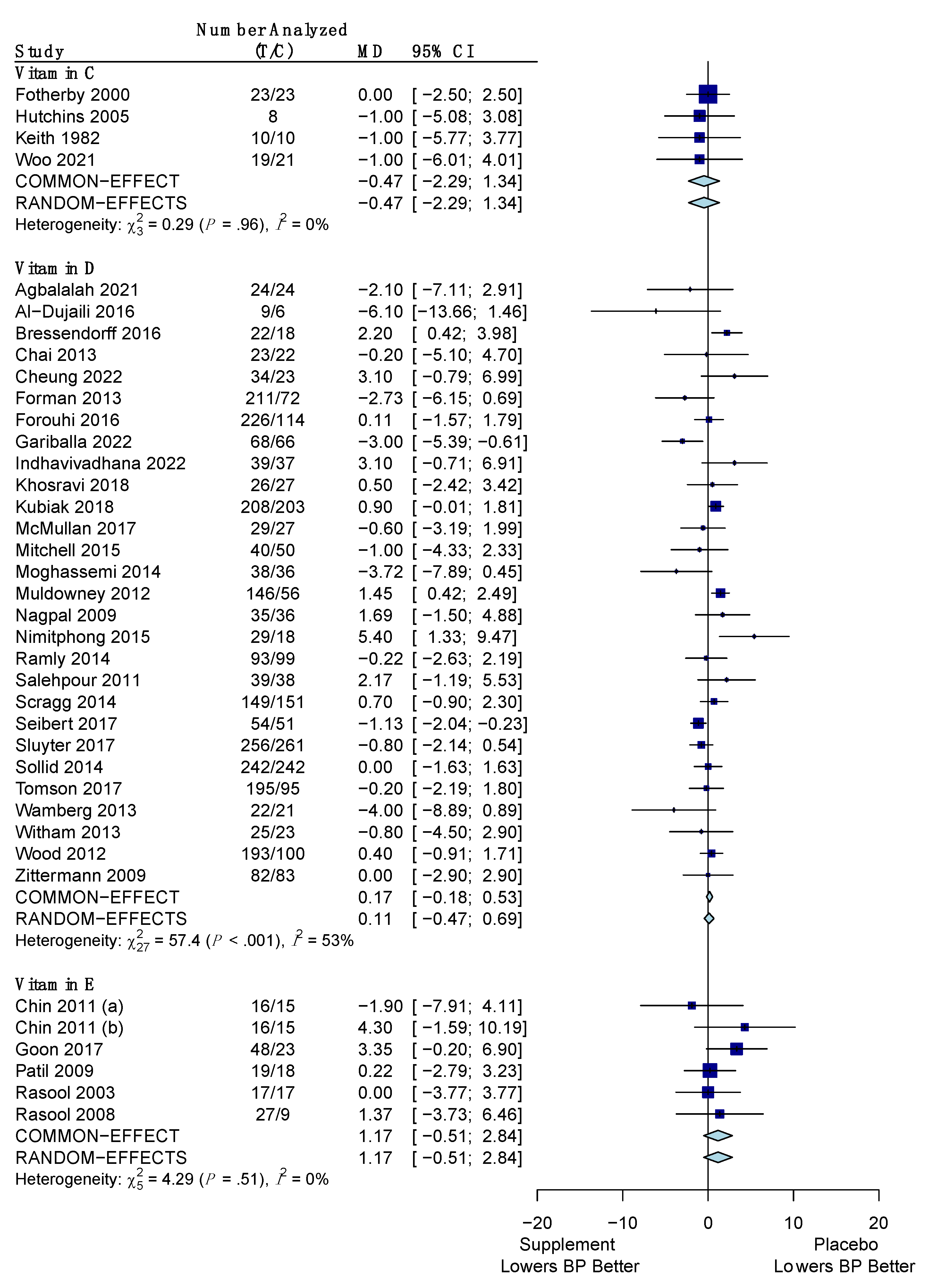 | Vitamin C | −1.45 mm Hg (−4.26, 1.35) | −0.47 mm Hg (−2.29, 1.34) |