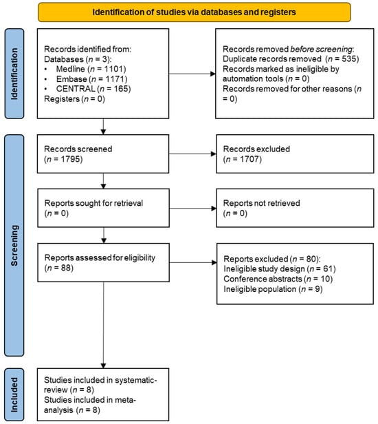 After the duplication removal, we screened 1795 references by title and abstract. Secondly, 88 articles were screened by full text. At the end of the selection process, eight RCTs with 1361 pregnant women were eligible to be included in this meta-analysis (Figure 1) [,,,,,,,].