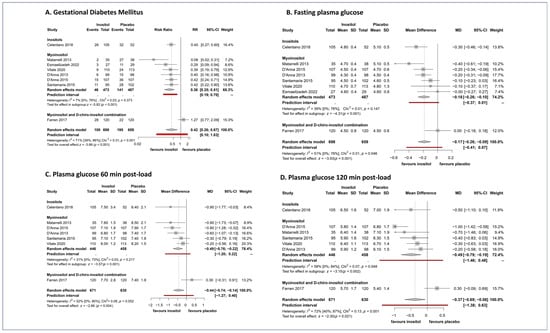 Inositol supplementation significantly reduced the fasting glucose level at the 24th–28th gestational week (MD = −0.17 mmol/L, CI: −0.26; −0.09) (Figure 2B). In the 60′ and 120′ post-load plasma glucose levels, a significant difference was observed in favor of inositols compared to placebo. It decreased OGTT 60′ glucose level on the average by MD = −0.44 mmol/L (CI: −0.74; −0.14) (Figure 2C) and it decreased OGTT 120′ glucose level by MD = −0.37 mmol/L (CI: −0.69; −0.06) (Figure 2D).