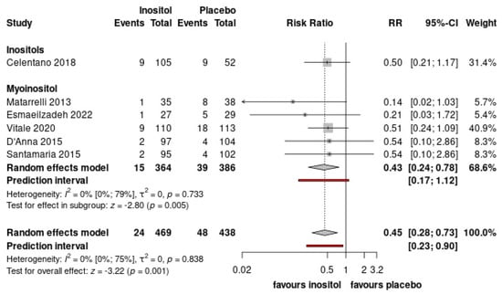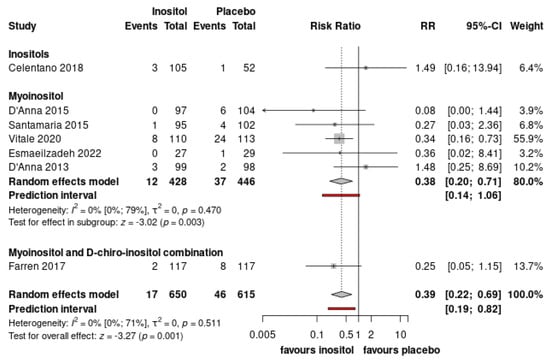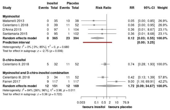Vitagliano et al. in their meta-analysis concluded a significant beneficial effect of inositol in reducing preterm birth but no effect on neonatal hypoglycemia []. Wei et al. draw the same conclusion to our analysis that inositol could reduce the risk of preterm birth and neonatal hypoglycemia, too []. Although Godfrey et al. in their RCT failed to show the preventive effect of inositol administration in combination with other supplements on GDM prevalence, they still concluded that the combined treatment reduced the risk of preterm birth []. Interestingly, if GDM patients are treated with 4 g of myoinositol, the risk of preterm delivery and the need for insulin is reduced. Therefore, inositol supplementation is useful not only for preventing GDM but also for preventing the complications of the manifest disease [,].