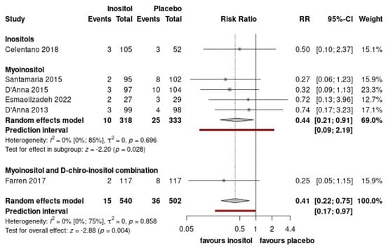 Based on the present analysis, inositol supplementation significantly reduces the risk of preterm birth (RR = 0.41, CI: 0.22–0.75) (Figure 5, Figure S7). However, no significant difference was observed regarding gestational age at birth (MD = 0.52, CI: −0.03; 1.08). The combination of myoinositol and DCI might favor gestational age at birth (MD = 0.36, CI: 0.00–0.71) (Figure S8). However, this is based only on the results of one study. No significant difference was found in the incidence of C-section (RR = 0.90, CI: 0.78–1.03) and the risk of shoulder dystocia (RR = 0.59, CI: 0.12–2.82) between in the intervention and control group (Figures S9 and S10).
