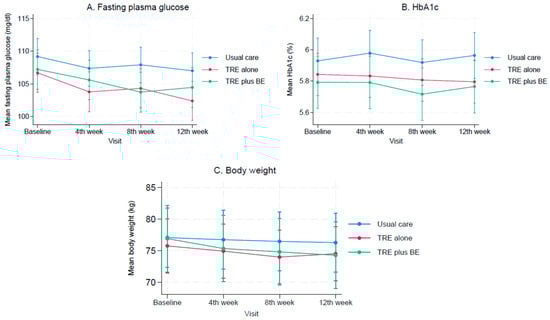 | FPG, mg/dL | TRE vs. Usual care | −3.03 (−7.00, 0.93) | 0.134 |