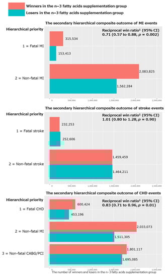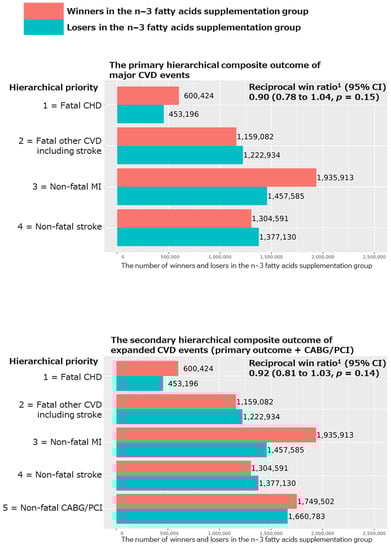 To investigate the effects of the n−3 fatty acids on the hierarchical composite outcomes, the present analyses used the win ratio method with the intention-to-treat principle. In this method, every patient on the n−3 fatty acids was compared with every patient on the placebo (i.e., comparing every possible patient-to-patient pair), considering a shared follow-up time that was determined as the minimum of their individual follow-up durations. To determine “winners” and “losers” [], pairs were categorized based on whether participants randomized to placebo experienced an outcome before those randomized to n−3 fatty acids during the follow-up period. In cases where both participants in a pair completed or exited the study without a fatal event (i.e., fatal CHD or other fatal CVD including stroke), their classification was determined with the occurrence of any non-fatal events (i.e., non-fatal MI or non-fatal stroke) in this priority for the primary hierarchical composite outcome. Ties occurred when it was not possible to determine whether a pair was a winner or a loser. The win ratio was calculated by dividing the total number of winner pairs by the total number of loser pairs. Win ratios were inverted to be easily compared with hazard ratios previously reported; thus, the reciprocal win ratios less than 1 indicate benefit of n−3 fatty acids. We estimated reciprocal win ratios using the R package “WinRatio” [].