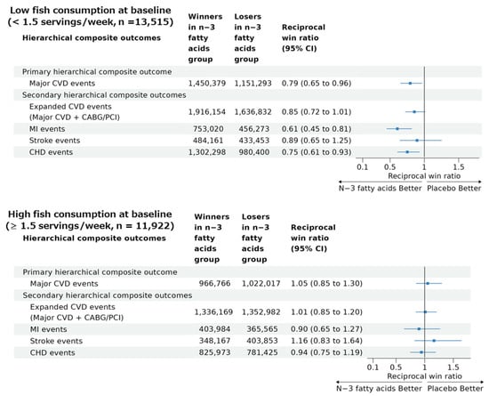 A significant benefit of the n−3 fatty acid supplementation on the primary hierarchical composite outcome was obtained in the subgroup of participants with lower dietary fish intake (reciprocal win ratio [95% CI] of 0.79 [0.65 to 0.96]), from which the total number of wins and losses was 1,450,379 and 1,151,293, respectively, in the n−3 fatty acid vs. placebo groups (Figure 3). On the other hand, in the participants with higher dietary fish intake (Figure 3), the total number of wins and losses was 966,766 and 1,022,017, respectively, in the n−3 fatty acid vs. placebo groups, resulting in a nonsignificant reciprocal win ratio (95% CI) of 1.05 (0.85 to 1.30). A percentile p-value for a difference in the two win ratios was 0.017 based on bootstrapping with 1000 resampling iterations.