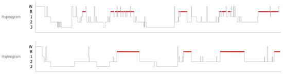 Sleep architecture changed from baseline hypnogram (Upper) to post-medication hypnogram (Lower). Sleep fragmentation improved after taking Poria cocos extracts, as did frequent awakening.