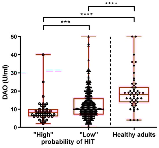 Serum DAO levels in patients with suspected HIT and healthy controls. The data are presented as medians with an interquartile range. Mann-Whitney; *** p < 0.001, **** p < 0.0001.
