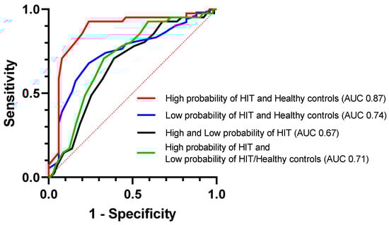 As indicated by the estimated area under the ROC curve (AUC), DAO measurements were the most accurate in discriminating between patients ‘‘high probability of HIT’’ and healthy controls (AUC 0.872 (95% CI, 0.79–0.95), sensitivity 93% (95% CI, 81–97%), and specificity 76% (95% CI, 63–86%); cut-off 13.5 U/mL). On the other hand, the ability to discriminate between patients with “high and low probability of HIT” was limited (AUC 0.667 (95% CI, 0.58–0.75), sensitivity 71% (95% CI, 56–82%), and specificity 61% (95% CI, 54–67%); cut-off 9.5 U/mL) (Figure 3).