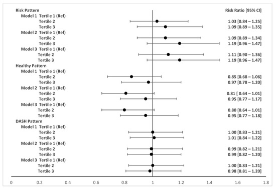 Figure 2 and Figure 3 show the adjusted associations between food consumption patterns during pregnancy and changes in BMI during follow-up at six and twelve months postpartum, respectively. Adherence to a dietary risk pattern in pregnancy (third tertile compared to first tertile) was associated with a 31% increase (RR 1.31; 95% CI 1.07–1.61) in maternal BMI between two and six months postpartum. Consumption of a healthy dietary pattern (second tertile compared to the first tertile) was associated with a 23% reduction (RR 0.77 95% CI 0.62–0.96) in maternal BMI between two and six months post-childbirth. The DASH pattern during pregnancy was not associated with postpartum BMI changes and no associations were observed between dietary patterns during pregnancy and BMI changes at 12 months postpartum.