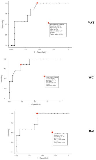 In males, we found the best negative value predictor for VAT ≤ 68 mm (Youden’s index: 0.556; AUC: 0.821; 95% CI: 0.66–0.99; p < 0.01), for waist circumference ≤ 100 cm (Youden’s index: 0.635; AUC: 0.893; 95% CI: 0.78–1.00; p < 0.01), and for BAI ≤ 30.72% (Youden’s index: 0.611; AUC: 0.833; 95% CI: 0.66–0.98; p < 0.01) (Figure 7).