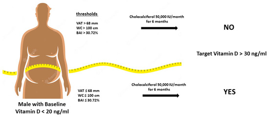 To establish potential cut-off values for predicting the increase in vitamin D levels, we performed a receiver operating characteristic (ROC) analysis in a subgroup of males with baseline vitamin D levels below 20 ng/mL, reaching normal values above 30 ng/mL at the end of the study. VAT, waist circumference, and BAI were identified as negative predictors in this subgroup.