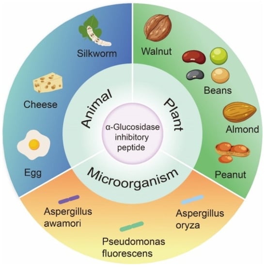 Bioactive peptides can be classified into natural peptides and synthetic peptides according to their sources [17]. Natural peptides are further divided into endogenous and exogenous active peptides [18]. Endogenous bioactive peptides are produced by human tissues and organs, while exogenous bioactive peptides are produced by proteases degradation and microbial fermentation. In this paper, the sources, preparations, identifications, and action mechanisms of α-glucosidases, as well as its bioavailability and treatment of diabetes, are reviewed, which will provide valuable references for the investigators in this field.