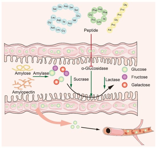 Many studies have shown that naturally active peptides could treat type 2 diabetes by lowering blood sugar, but screening for them is a time-consuming process [106,107]. To discover safer and more effective α-glucosidase inhibitory peptides, it is particularly important to explore the interaction mechanism between α-glucosidase inhibitory peptides and α-glucosidase. Based on recent studies, it is concluded that the main mechanism of action is to inhibit α-glucosidase activity in small intestine mucosa (Figure 4). The bioactive peptide mainly binds to oligosaccharides and enzymes, producing competitive inhibition. The peptides act on the enzyme through the hydrophobic effect and hydrogen bonding van der Waals forces, modulating the amino acids at the catalytic sites of the enzyme to affect its original activity and reduce glucose intake [46,108,109]. In recent years, researchers have summarized the structural features and mechanism of α-glucosidase inhibitory peptides: (1) Low-molecular-weight peptides have better α-glucosidase inhibitory activity [110]; (2) Amino acids contain at least a hydroxyl or basic side chain at the N-terminus, with Pro present in the penultimate position at the C-terminus [8]; (3) The presence of Arg at the C-terminal end improves the stability of the peptide–enzyme binding, ensures strong binding of peptides to key active amino acid residues of the enzyme, and promotes increased inhibitory activity [61]; (4) The higher the content of hydrophobic amino acids, the better the inhibitory activity of α-glucosidase.