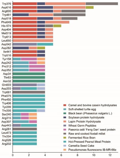 Summary of the key binding sites of α-glucosidase with some typical peptides. The data are based on the peptides mentioned in the literature of this paper that underwent molecular docking. The horizontal coordinate is the number of polypeptides and the vertical coordinate is the key binding site; this graph selects the binding sites with more than 2 polypeptides, different colors represent different sources, and the length of the color represents the number of polypeptides.