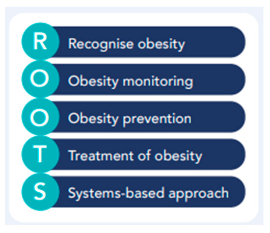 The five pillars of the ROOTS Framework; an integrated, equitable, comprehensive and person-centred approach to addressing obesity [4]. Reproduced with permission from the World Obesity Federation, 2023.