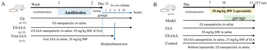 Female Sprague–Dawley (SD) rats (7 weeks old, weighing 180–200 g) were purchased from Weitonglihua Experimental Animal Tech Co. (Beijing, China). All procedures involving animal subjects adhered to the Institutional Animal Care and Use Committee guidelines (Jiangsu, China) and were approved by the Ethics Committee of Experimental Animals at Jiangnan University (JN No. 20220615S0880902 [224]). The experimental schedule is described in Figure 1A. To deplete gut microbiota and the associated metabolite IAA, the rats were administered with an antibiotic solution consisting of 1 g/L of neomycin sulphate, ampicillin, and metronidazole; 0.5 g/L vancomycin hydrochloride, and 0.1 g/L acesulfame potassium in 4 mM acetic acid for a week. Normal drinking water was provided one day before the next experiment. Following this treatment, rats were randomly allocated into two groups (n = 15): the ES-IAA group and the ES group. Specifically, 1 mL of IAA-loaded ES nanoparticles (ES-IAA, IAA dose: 50 mg/kg body weight, BW) or IAA-free ES nanoparticles were administered orally to rats that had fasted overnight. At predetermined sampling intervals (t = 1 h, 2 h, 4 h, 6 h and 10 h), the contents of the stomach, small intestine and colon were collected (n = 3) from each group. The contents were lyophilised, weighed and then mixed with 900 μL MeOH/H2O (1:1). After homogenisation and centrifugation, the supernatant was concentrated to evaporate the solvent. The resulting samples were dissolved in 100 μL MeOH/H2O (1:9) and filtered using a 0.22 μm syringe filter for HPLC analysis. For the biodistribution study, rats were separately administered with ES-IAA nanoparticles and free IAA (n = 3, IAA dose: 50 mg/kg BW). After 4 h, the liver, kidney, spleen, lung, stomach, small intestine, cecum, colon, brain, hepatic portal vein, and arterial blood were collected, and the IAA concentrations were determined using HPLC. The pretreatment of tissues and organs was performed, as described earlier [13].