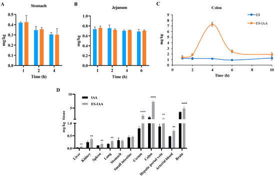 In vivo release and biodistribution of IAA. The detection of IAA in the stomach (A), jejunum (B) and colon (C) in rats treated with empty or IAA-loaded nanoparticles. The blue column is group ES, the orange column is group ES-IAA. (D) IAA contents in different tissues 4 h after oral gavage with free IAA and ES-IAA nanoparticles. Significance analysed by Student’s t-test (** p < 0.01 and **** p < 0.0001).