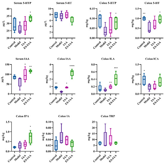 Furthermore, the accumulation of IAA in the colonic contents of rats administered ES-IAA nanoparticles was higher than that in the IAA group (Figure 6). Under IAA intervention, an increase in ILA and IPA formed via microbiota metabolism was observed. Simultaneously, the IAA and ICA levels decreased in rats with slow gut peristalsis induced by loperamide, indicating disruptions in tryptophan metabolism due to changes in the gut microbiota. Correspondingly, reductions in the CYP1A1 and AHR protein expression levels were present in the model compared with the control, which could aggravate slow colon transit. In addition, the levels of 5-hydroxytryptophan (5-HTP) and 5-hydroxytryptamine (5-HT) in the colon, which are secreted by enterochromaffin cells and can regulate gut peristalsis, significantly increased in the ES-IAA group. Overall, our experiments demonstrated how IAA could activate the AHR signalling pathway to regulate gut motility by providing additional AHR ligands.