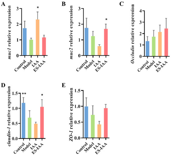 The relative expression of mucin and tight junction proteins affected by IAA. The mRNA levels of Muc1 (A), Muc2 (B), Occludin (C), Claudin-1 (D) and ZO-1 (E). Statistical analysis was carried out using one-way ANOVA with Dunnett’s multiple comparisons test compared with the model group, * p < 0.05 and ** p < 0.01.