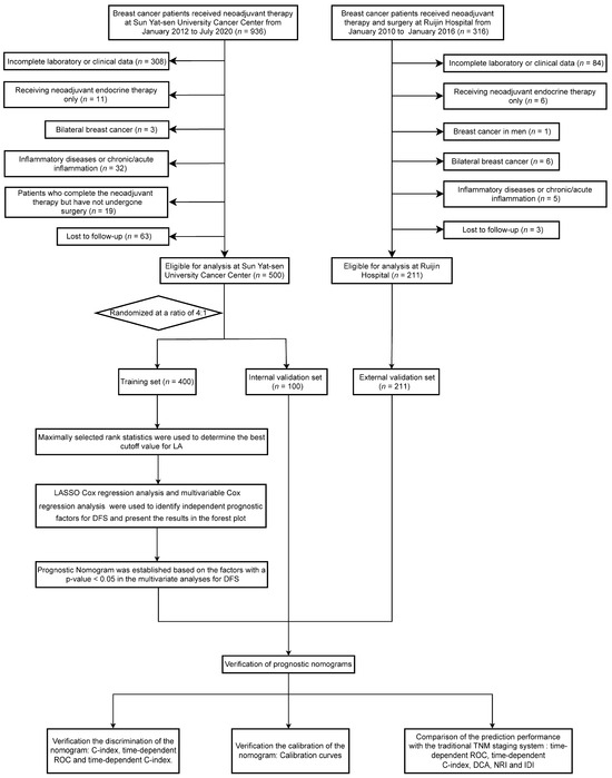 In our study, we retrospectively screened 1252 patients with breast cancer who received neoadjuvant therapy at two hospitals: 936 patients at Sun Yat-sen University Cancer Center (SYSUCC) from January 2012 to July 2020 and 316 patients at Ruijin Hospital from January 2010 to January 2016. The following criteria were used for inclusion: (1) Patients with non-metastatic breast cancer aged ≥18 years who received NAC. (2) Before NAC, all patients underwent ultrasound-guided diagnostic core needle biopsy of the primary tumor. Additionally, for lymph nodes suspected to be positive on ultrasound examination, the nodal status was determined by fine needle aspiration. (3) All patients underwent rigorous clinical imaging examinations (e.g., ultrasound, CT, MRI, etc.) before NAC and were ultimately diagnosed with stage I-III breast cancer. (4) Patients’ laboratory data before NAC were available. (5) Follow-up and clinical pathology information for the patients were complete. The following criteria were used for exclusion: (1) Patients with bilateral or inflammatory breast cancer. (2) Male patients. (3) Patients who were treated solely with neoadjuvant endocrine therapy. (4) Patients who completed the NAC but had not undergone surgery. (5) Patients with inflammatory diseases or chronic/acute inflammation, including autoimmune diseases. (6) Patients with a history of malignancies at other sites. Finally, a total of 711 patients were analyzed in the present study. Specifically, 500 patients from Sun Yat-sen University Cancer Center were allocated into training and internal validation cohorts randomly, with a ratio of 4:1. Concurrently, an additional 211 patients from Ruijin Hospital were assigned to the external validation set. The patient inclusion process and the study design are shown in Figure 1. The Research Ethics Committee of Sun Yat-sen University Cancer Center and Ruijin Hospital approved the present retrospective study, and confidentiality was maintained for the data of all patients.
