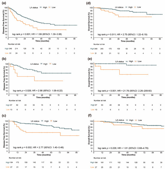 Kaplan–Meier curves of various survival endpoints between the high-LA group and low-LA group. For disease-free survival in different LA level groups: (a) Training cohort survival curves. (b) Internal validation cohort survival curves. (c) External validation cohort survival curves. For overall survival in different LA level groups: (d) Training cohort survival curves. (e) Internal validation cohort survival curves. (f) External validation cohort survival curves.