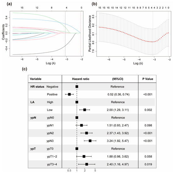Significant factors determination using LASSO Cox and multivariate Cox regression model. (a) A coefficient profile plot of 15 factors associated with DFS in the training set. The bottom horizontal axis represented the log lambda (λ) values of the independent variable, the top horizontal axis indicated the number of variables with non-zero coefficients, and the vertical axis represented the coefficients of the independent variable. Different-colored curves represented different variables, with each curve depicting the trajectory of the coefficient variation for each independent variable. The black dotted vertical line (left), positioned at the λ value where the bias was minimized, indicated the optimal model fitting point with four non-zero coefficients. The red dotted vertical line (right) was located at one standard error to the right of the minimum lambda value. (b) Four non-zero coefficient variables selected through ten-fold cross-validation via optimal lambda. Dotted vertical lines were placed at the optimal log(λ) values determined by both the minimum criteria and one standard error. (c) Multivariate Cox regression analysis on the four variables selected through Lasso Cox regression presented in a forest plot. Abbreviations: HR, hormone receptors; CI, confidence interval.