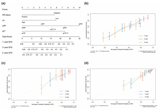 Table S2 displays the univariable analysis of DFS via Cox regression analysis in the training cohort. cT Stage, ypN Stage, ypT Stage, pCR, LA, and HR status are the factors of statistical significance (p < 0.05). We used the LASSO Cox regression model to address the problem of multicollinearity upon regression in the training cohort (Figure 3a,b). Subsequently, at the optimal lambda value with minimal bias, we identified four indicators associated with DFS, each having non-zero coefficients. These indicators included ypT stage, ypN stage, HR status, and LA, all of which were incorporated into the multivariate Cox regression model. In the multivariable modeling, the proportional hazards diagnostic tests confirmed that the assumption of proportional hazards was met (Figure S2). Finally, multivariable Cox regression analysis demonstrated that LA had the capability to predict DFS independently (HR = 2.00, 95% CI: 1.29–3.11, p = 0.002). Furthermore, negative hormone receptor status, larger ypT stage, and elevated ypN stage were all found to be independent predictors of adverse DFS for breast cancer patients who underwent NAC. Furthermore, we visually depicted the aforementioned multivariate Cox regression outcomes using a forest plot (Figure 3c). Afterwards, a novel prognostic model based on those aforementioned four independent prognostic factors was established and visually represented as a nomogram for predicting the 1-, 3-, and 5-year DFS of breast cancer patients with NAC (Figure 4a). A corresponding score was assigned to each prognostic factor, and by summing up the scores associated with all the prognostic factors, the total score for each individual was determined. The total score was then located on the survival rate scale to predict the 1-, 3-, and 5-year DFS rate of the patients before the implementation of subsequent adjuvant therapy. It was evident that higher total scores in patients were associated with a decreased probability of individual DFS.